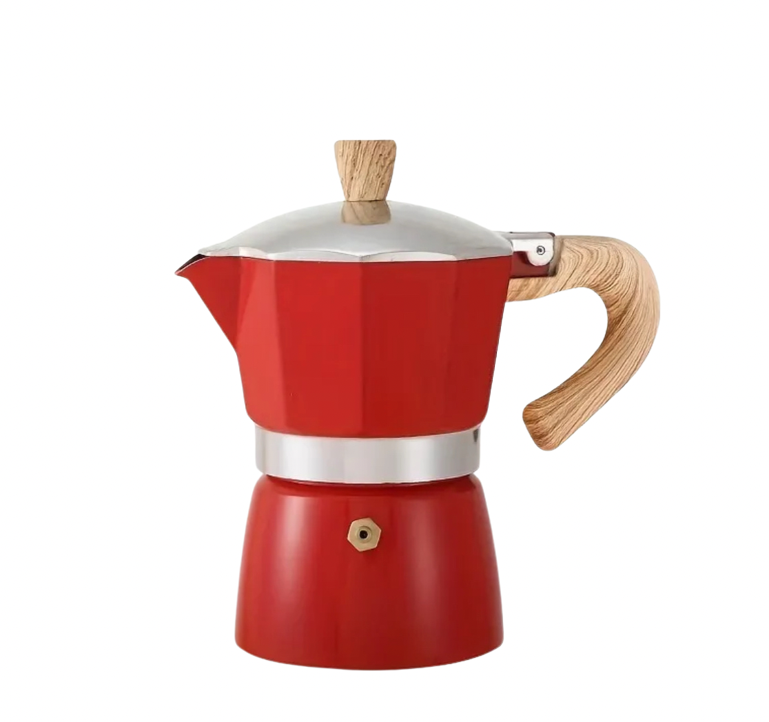 ☕️ Greca roja con una capacidad de 3 tazas y sus terminaciones son en madera.
